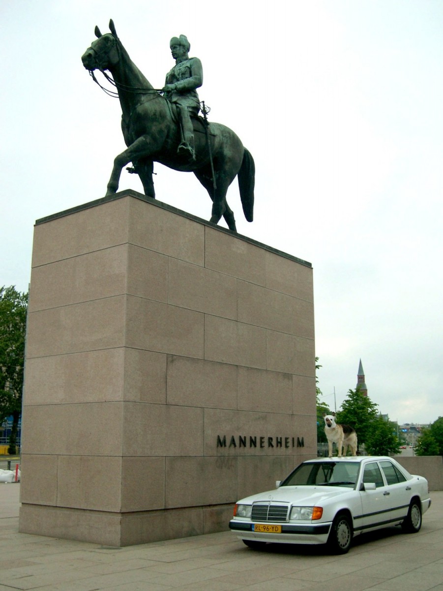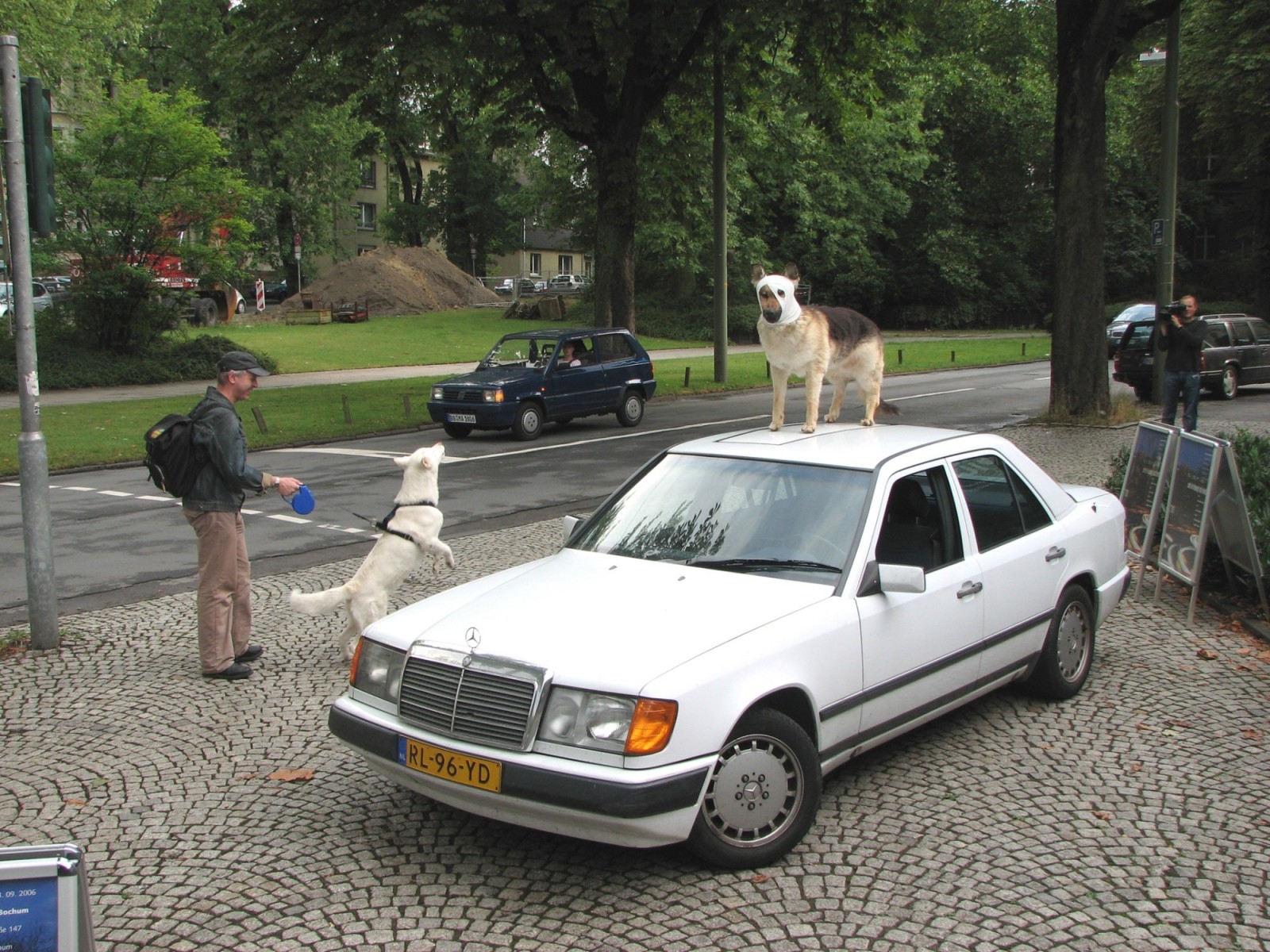A German shepherd dog, standing beside the driver, is riding in a white Mercedes. Suddenly the dog rises through an opening in the car up to the top of the roof. After a little while the dog disappears back in the car.