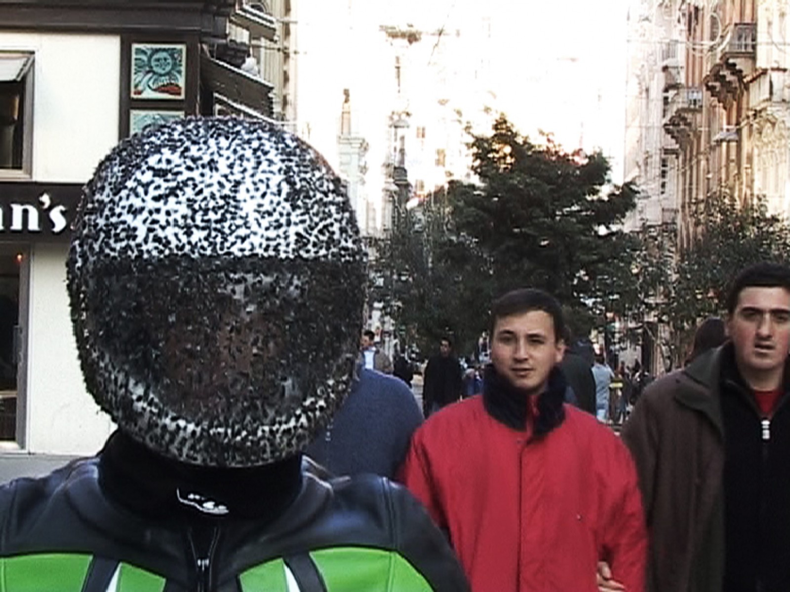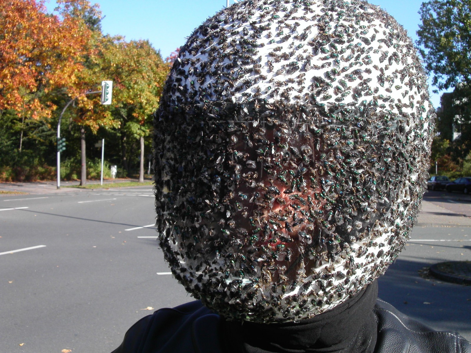 With his helmet on, a motorcyclist walks down the street. He appears as if he would only make a short stop, while his motorbike is parked somewhere around the corner. His helmet is completely covered with dead flies.The biker appeared on different locations in Münster, (Germany) and Istanbul’s district Beyoğlu (Turkey).