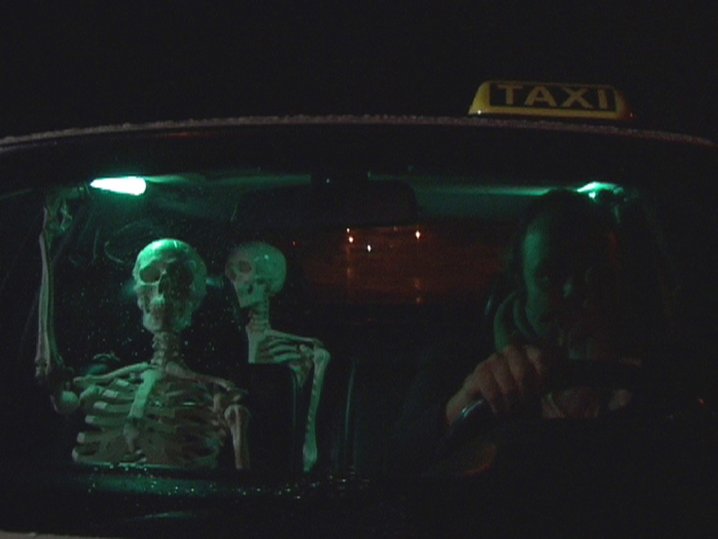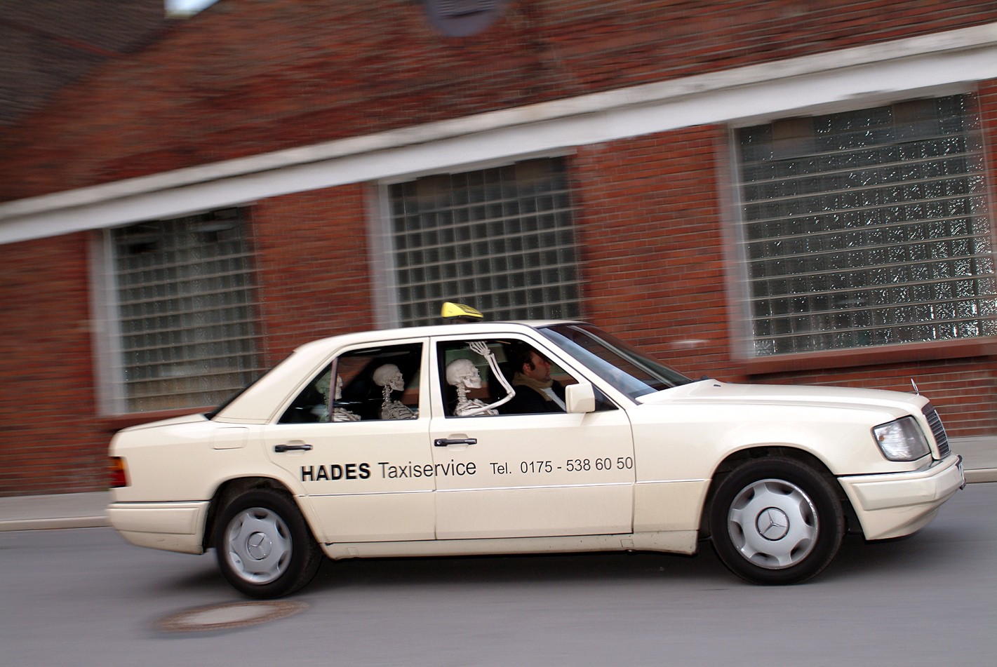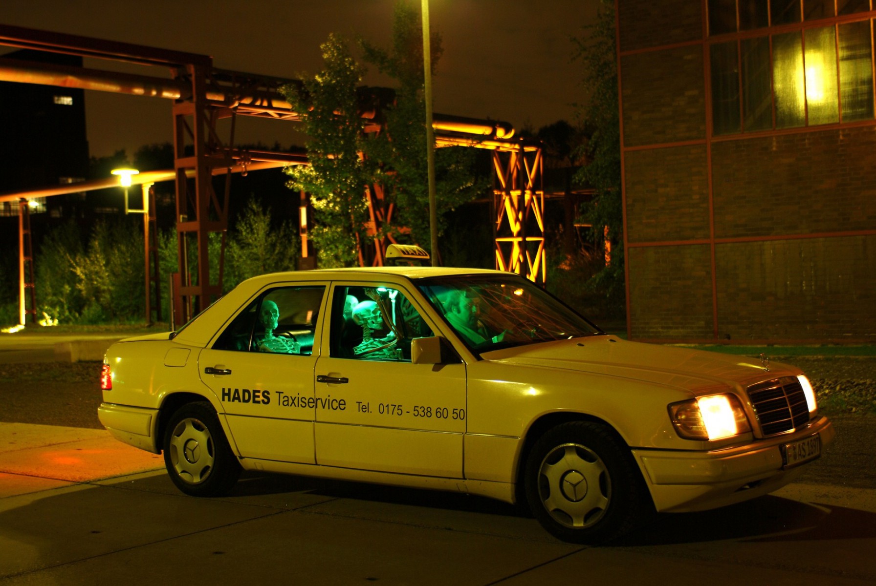 A typical German taxi (an ivory – white Mercedes), fully occupied with three human skeletons, is driving around in Essen, a city in the west of Germany, located in the Ruhrgebiet. Following the main traffic routes, the taxi passed by stations, taxi-stands and other places where customers wait for taxis. In the evening and night hours the taxi was unobtrusively illuminated with a green light.