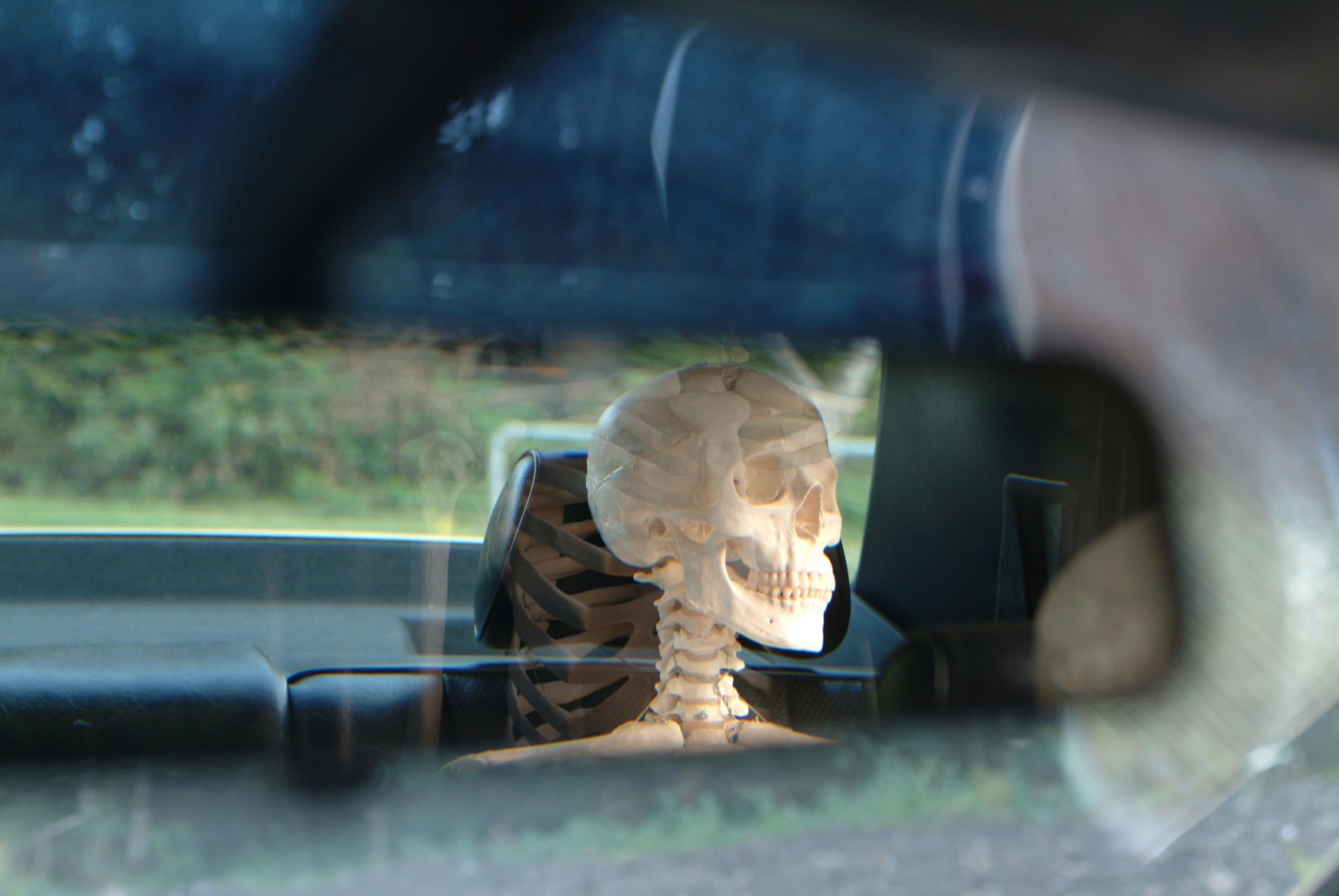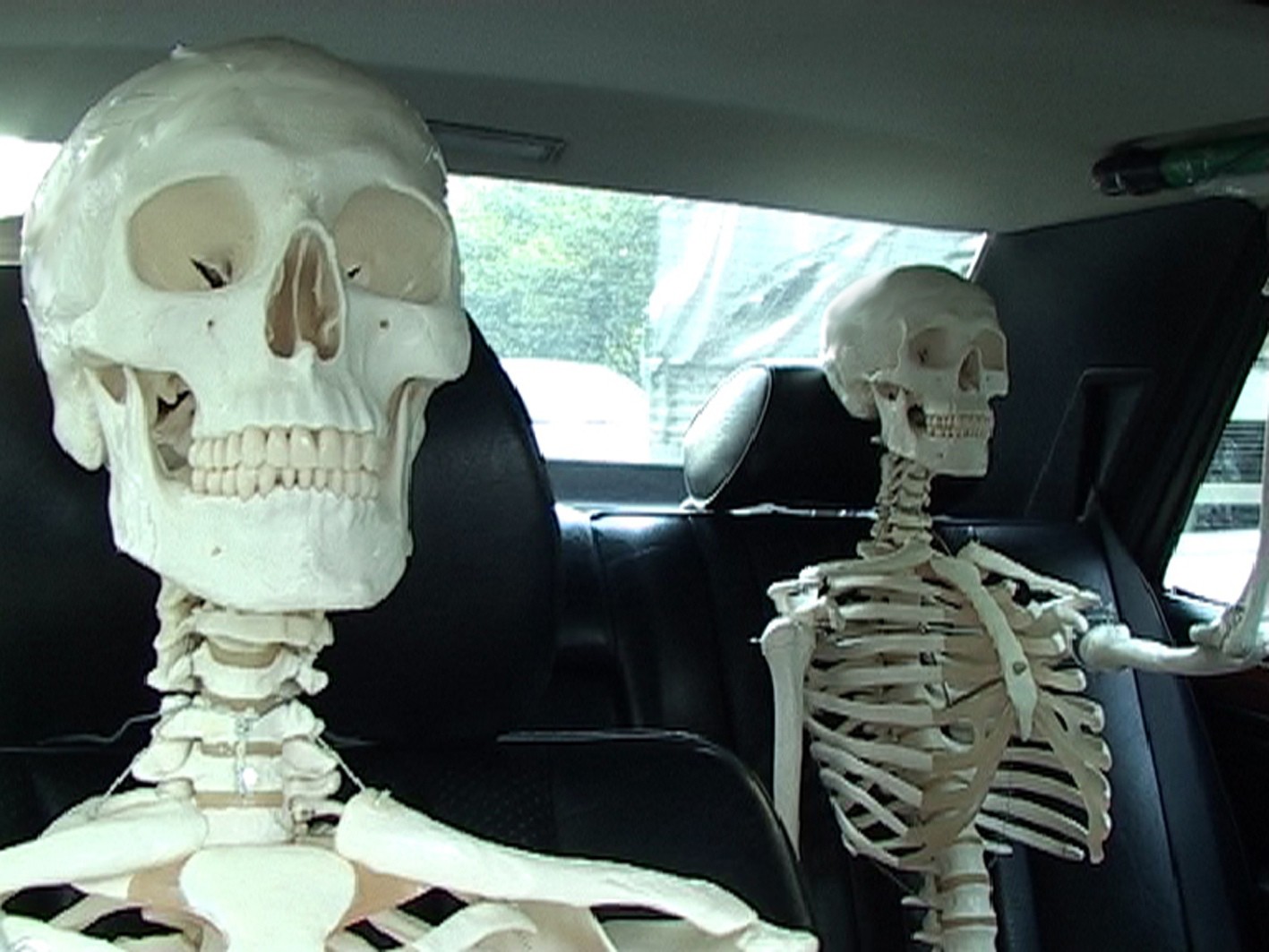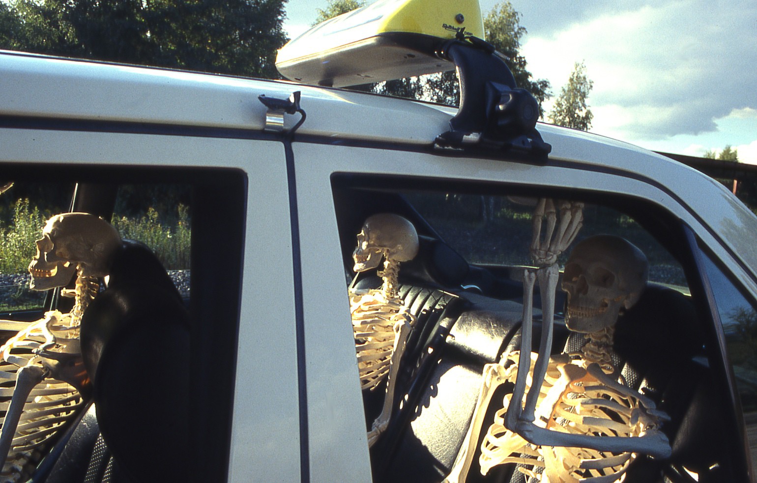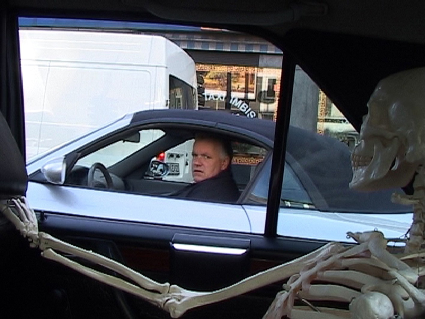 A typical German taxi (an ivory – white Mercedes), fully occupied with three human skeletons, is driving around in Essen, a city in the west of Germany, located in the Ruhrgebiet. Following the main traffic routes, the taxi passed by stations, taxi-stands and other places where customers wait for taxis. In the evening and night hours the taxi was unobtrusively illuminated with a green light.