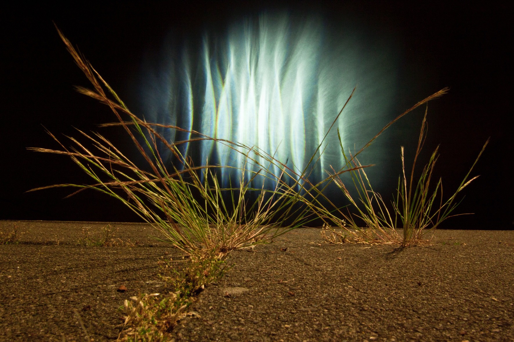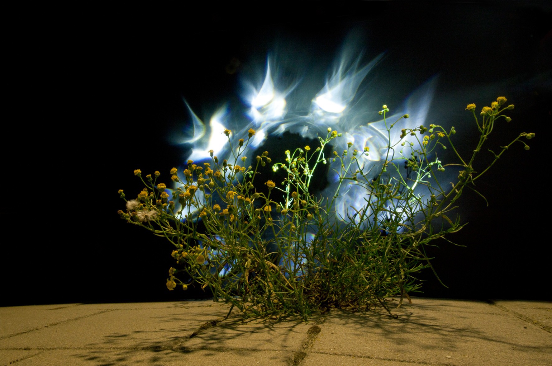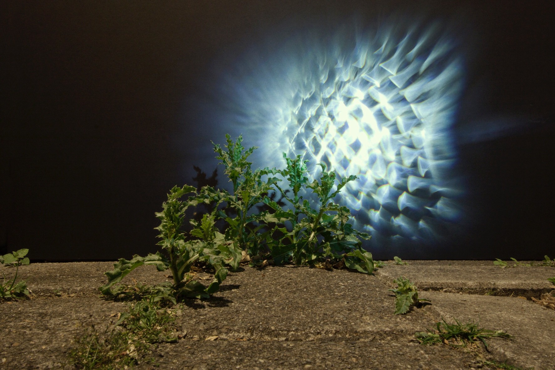 On the Edge of Darkness is a row of night-time photographs of urban weeds that are innate to the streets of Amsterdam. Fractured light, which is created with a self-made device, illuminates urban street sceneries of wild growing weeds. Together with the given street lighting, which is frequently a new type of LED lamp, the situations are captured with long-time exposures.