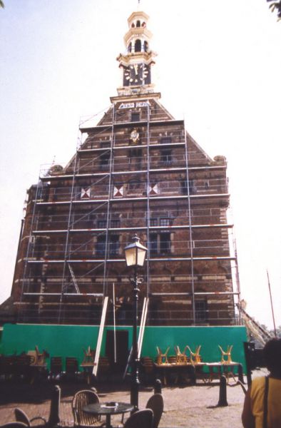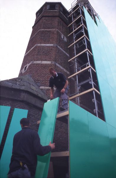 Many buildings in the historical city of Hoorn are similar to a taxidermied animal: their casing is meticulously preserved while the inside is completely renewed. This association was one of the starting points of the project, with the goal of creating a new monumental skin for the tower. The building façade, together with the matching car, becomes a sort of 'landscape collage'. In contrast to the tower's historic and aesthetically pleasing architecture, the new façade’s effect reminds us of the architecture and landscape of industrial areas: here we often find corporate identities looming large, both buildings and vehicles have the same design and color. These two, usually distinct areas of the city landscape—the historic landmark and the corporate office park—come together in this installation to play with the expectations and parameters that commonly differentiate these spatial allocations. The complex relation between these two very different areas of a city becomes visible. At the same time, the work also hints at the politics of this architectural and spatial nostalgia; the banality of an ordinary green car takes possession and brands a building that is usually reserved to represent the public’s imagination of a shared and revered culture and history.