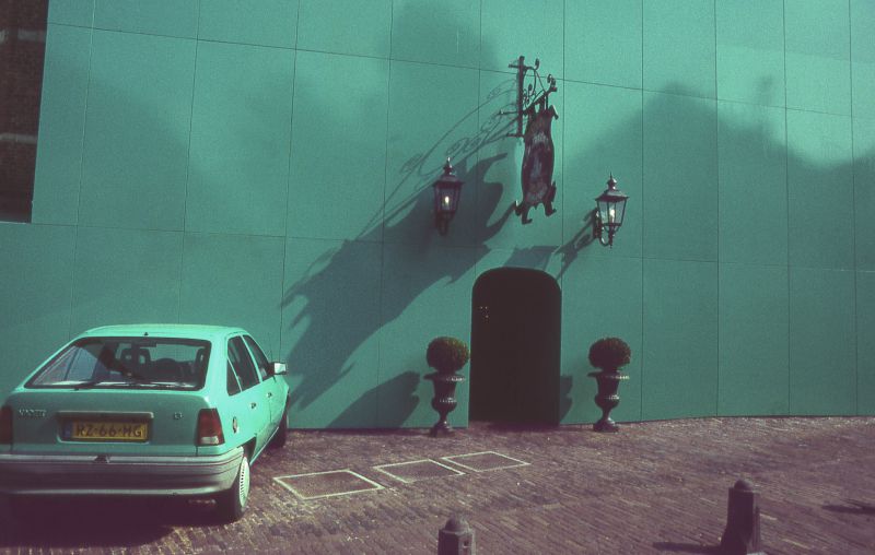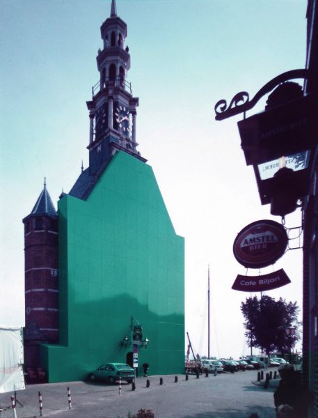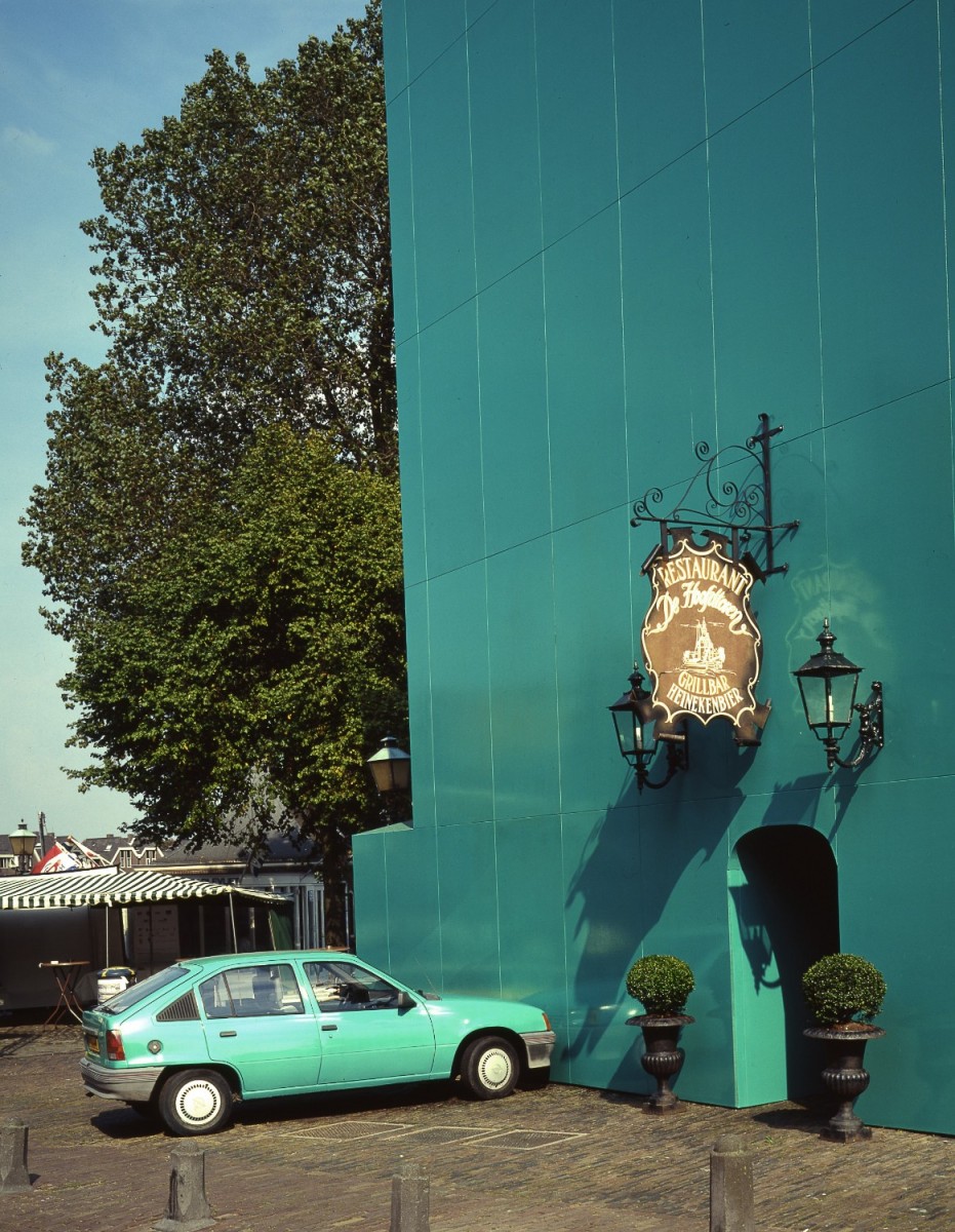 The Green Car was installed at ‘Hoofdtoren’, in the historic city-centre of Hoorn, Netherlands. Built in the 16th century by the Dutch whaling trade group, Noordsche Compagnie (Northern Company), this defense tower is one of the most important architectural monuments in the city. For the project, the street-side of the building acquired a completely new façade, coated with green lacquer paint. The surface and color matched exactly with an Opel Kadett car which was parked right in front of the building. The only break in the new façade was a small doorway, allowing entrance to the restaurant that is located in the tower. Apart from the entrance, the only other details that were kept from the building’s earlier appearance were the restaurant sign, lamps and two large flowerpots.