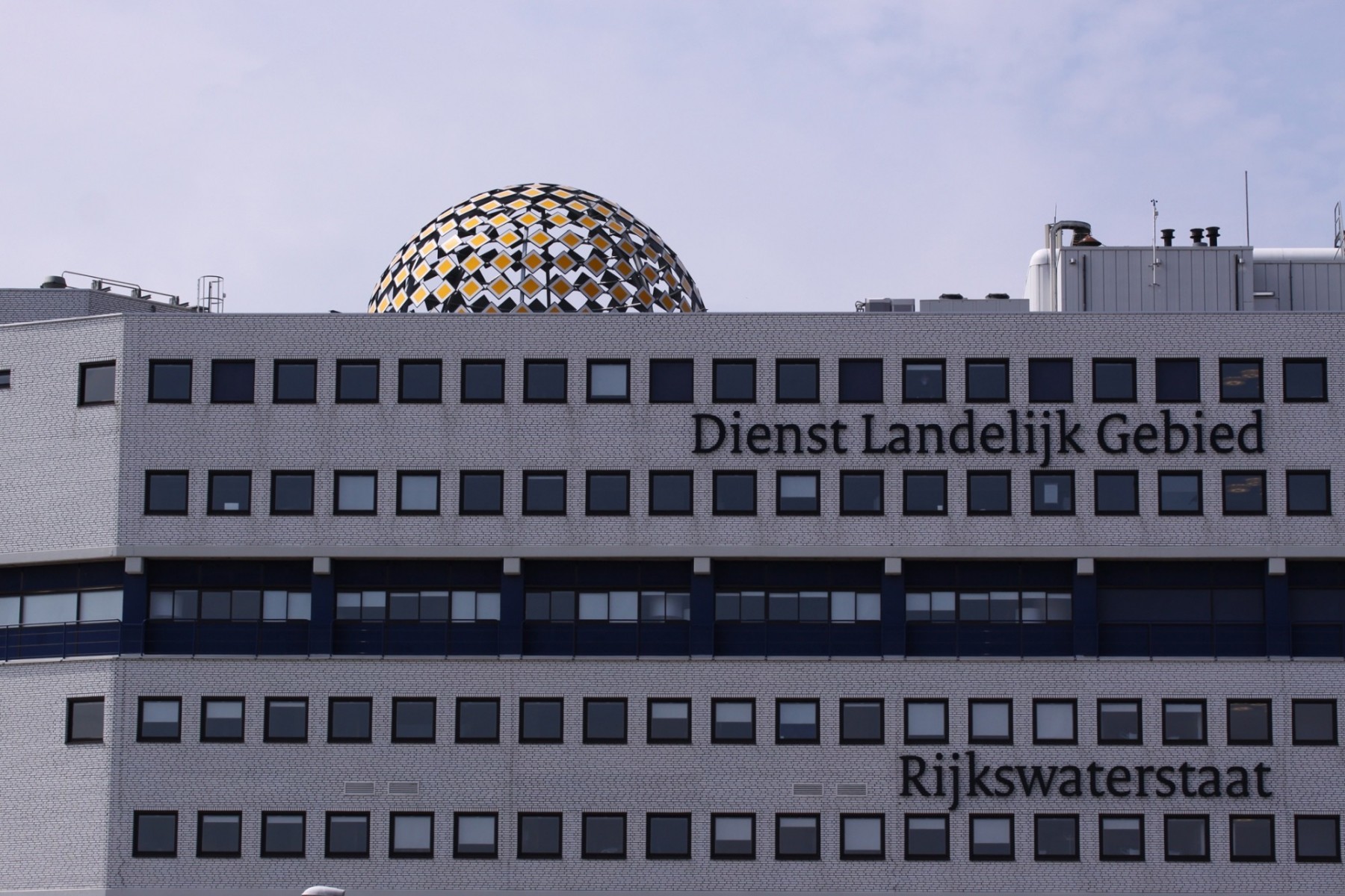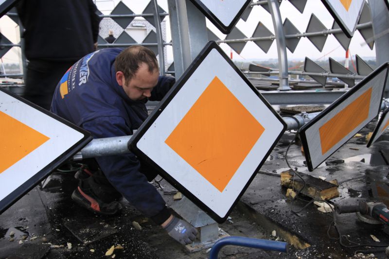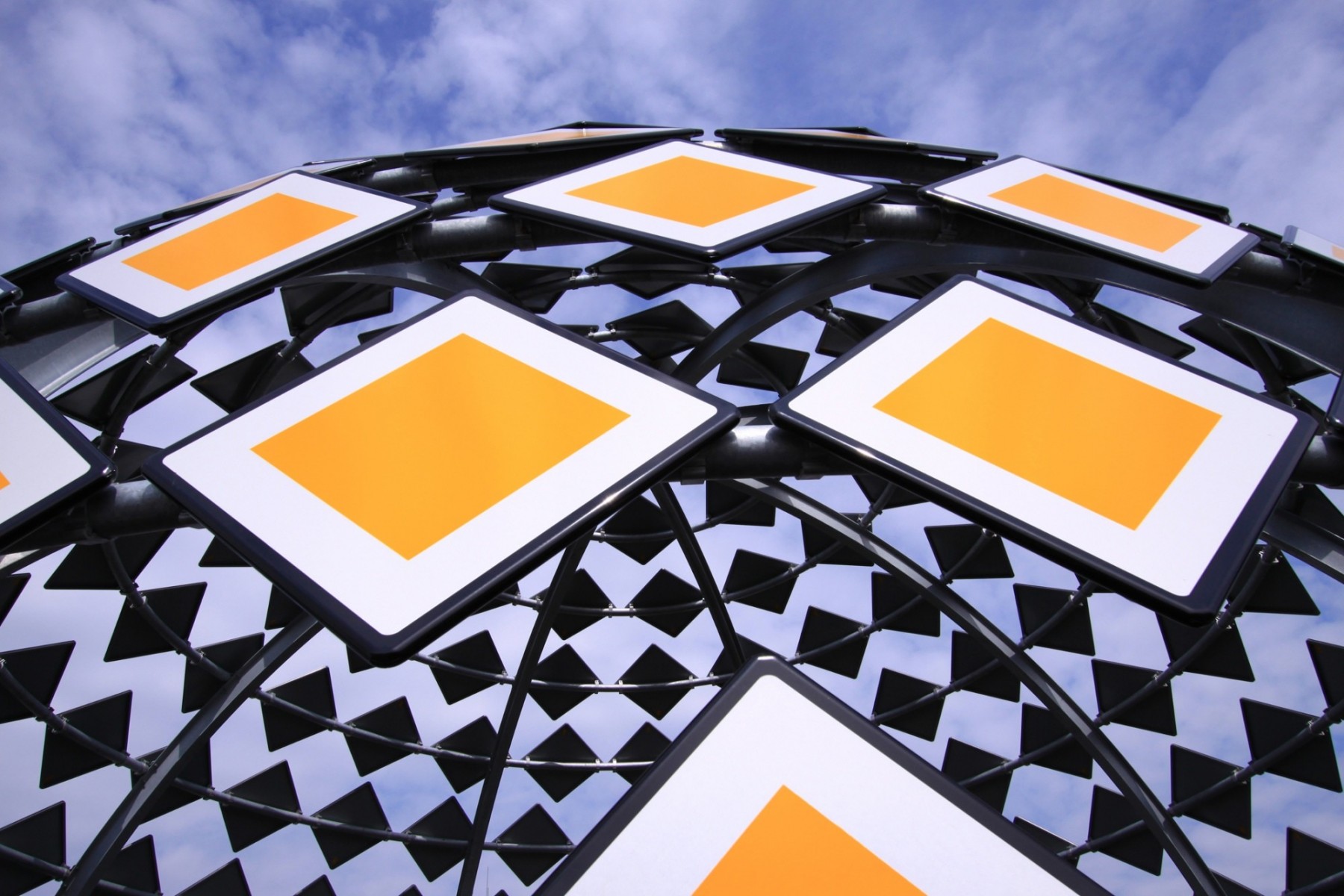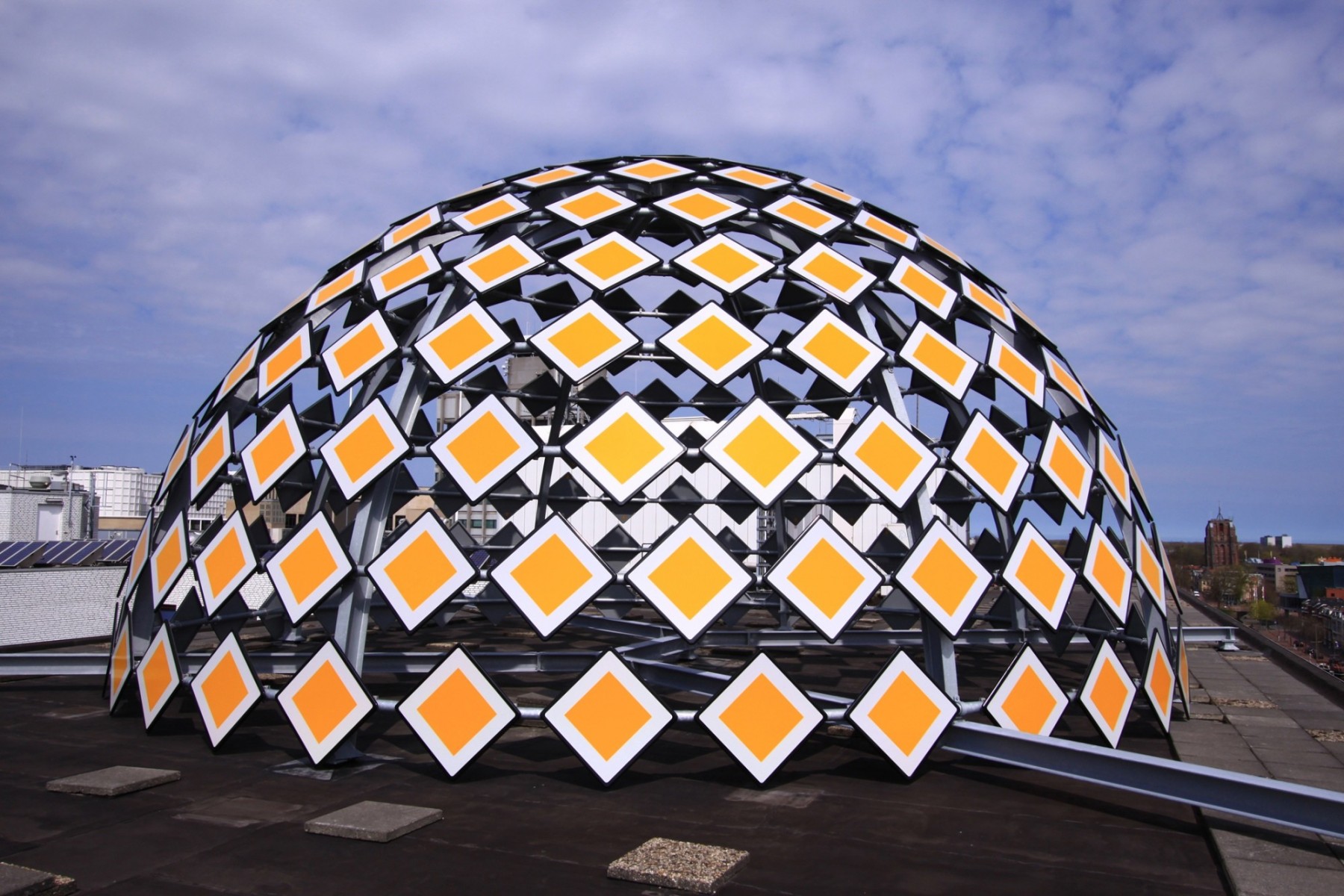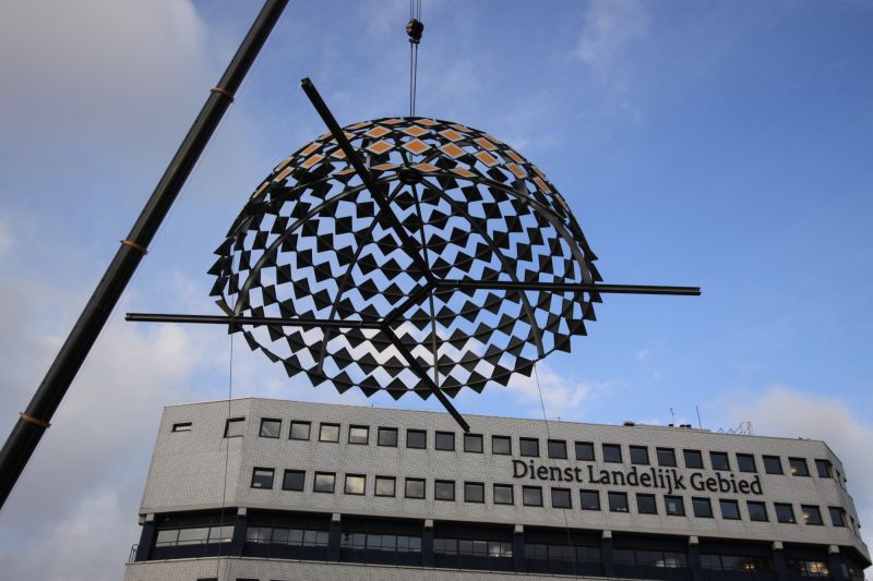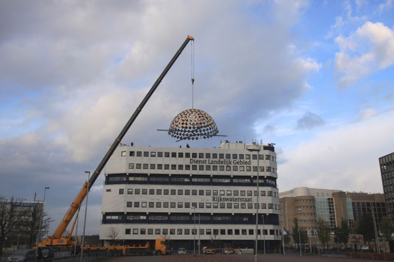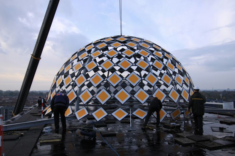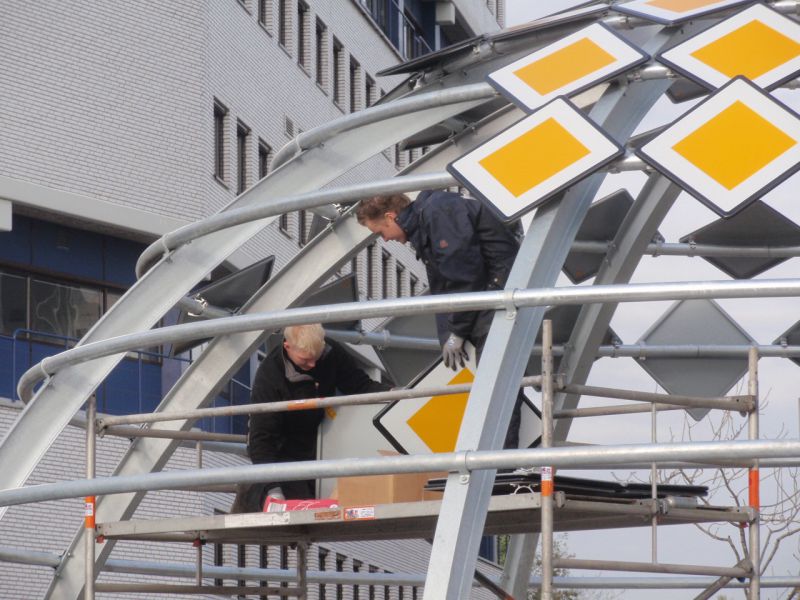The Priority Dome is a permanent installation sited on the roof of Middelzeehuys, a government building in Leeuwarden. The building is home to the Dutch Ministry of Infrastructure and the Environment, as well as theGovernment Service for Land and Water Management. In addition to other tasks, these government departments are primarily responsible for the management of the road network and car traffic of the Netherlands.The sculpture is 11 m in diameter, 6 m high and weighs 8 tons. The surface of the dome consists of 250 (European) standard 'priority road' traffic signs.