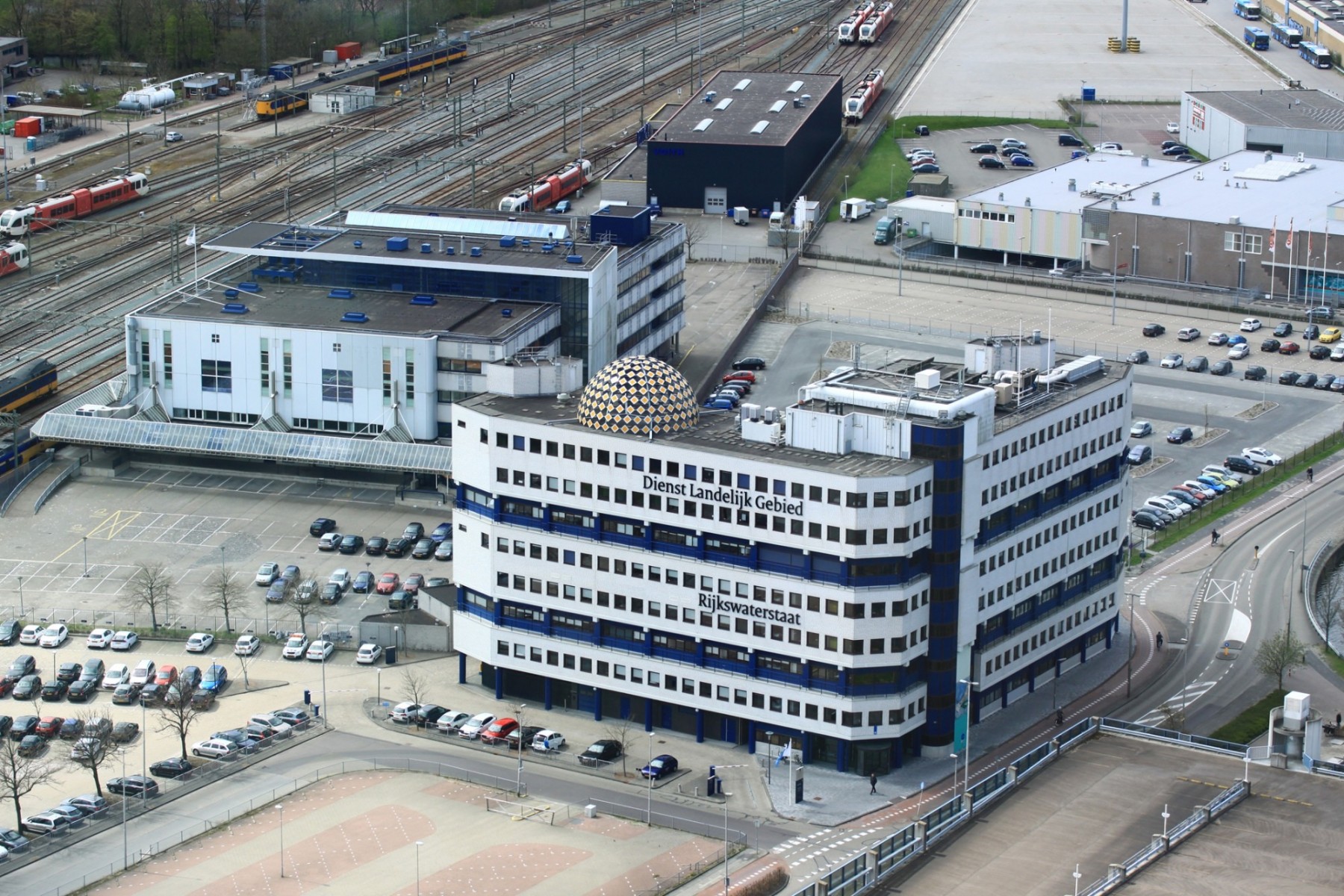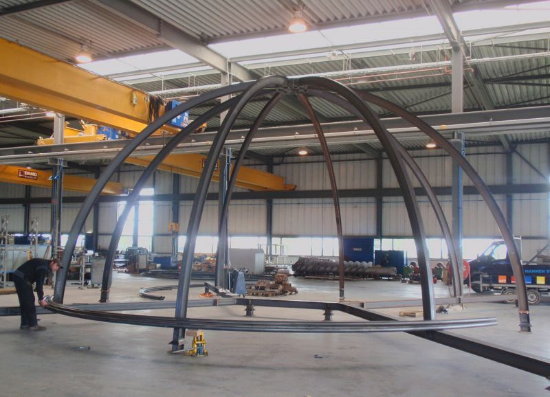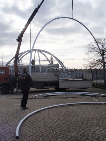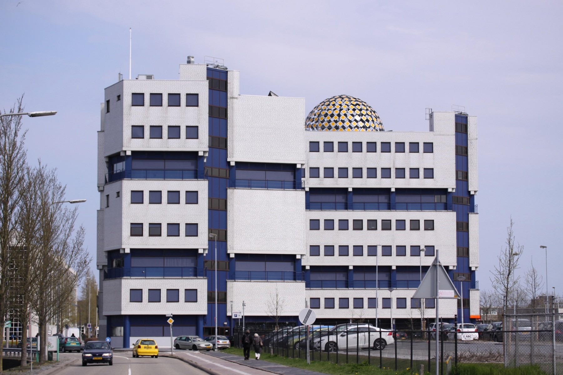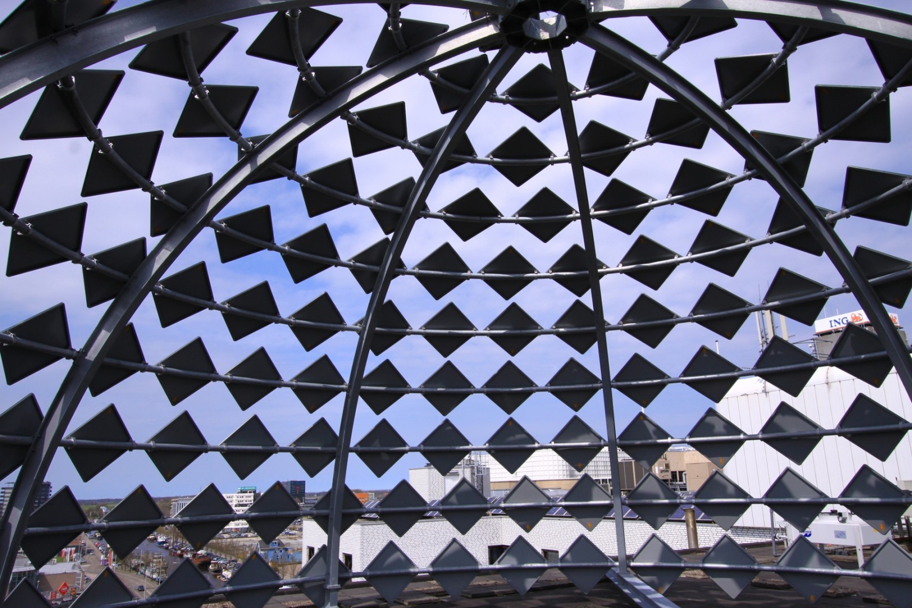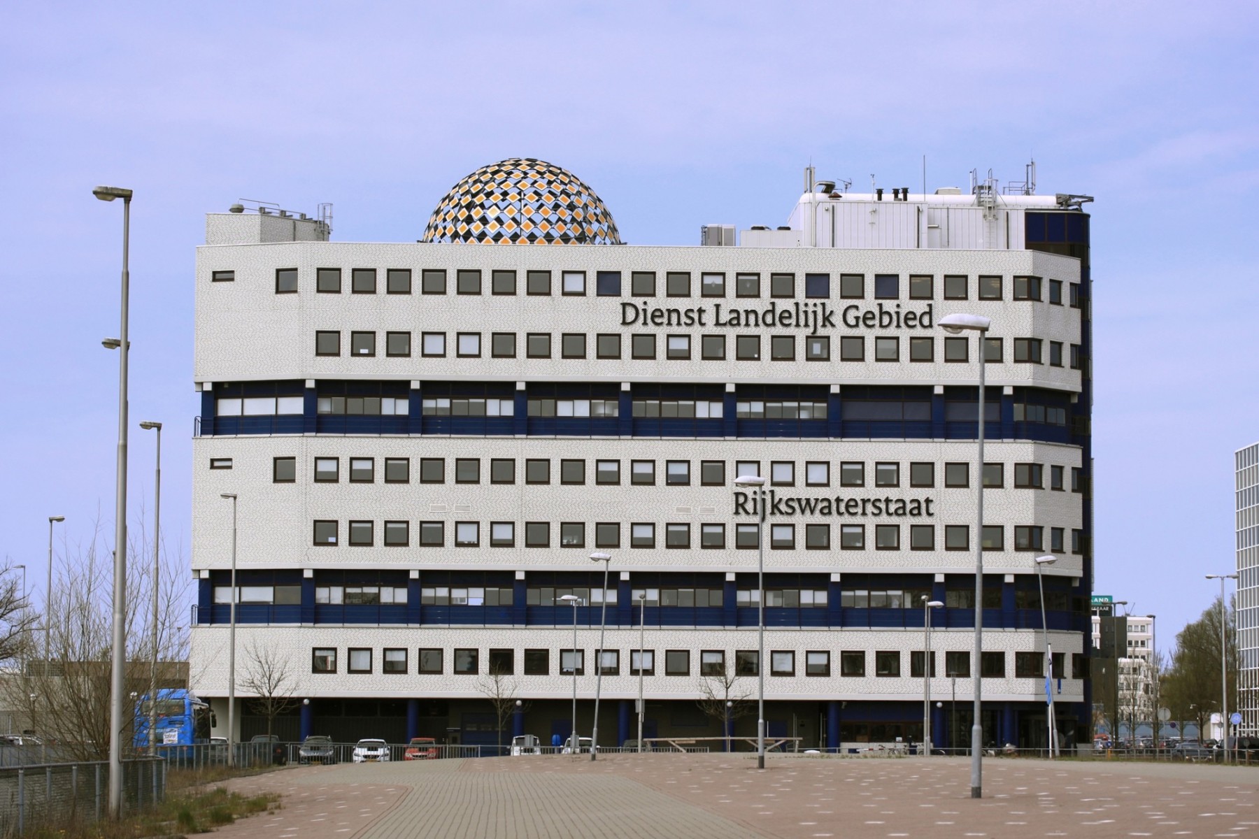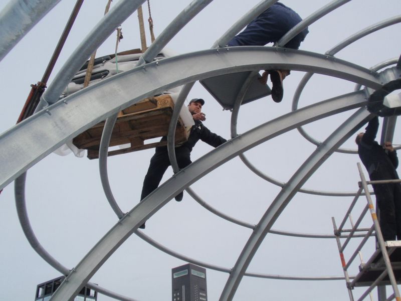 The Priority Dome is a permanent installation sited on the roof of Middelzeehuys, a government building in Leeuwarden. The building is home to the Dutch Ministry of Infrastructure and the Environment, as well as theGovernment Service for Land and Water Management. In addition to other tasks, these government departments are primarily responsible for the management of the road network and car traffic of the Netherlands.The sculpture is 11 m in diameter, 6 m high and weighs 8 tons. The surface of the dome consists of 250 (European) standard 'priority road' traffic signs.