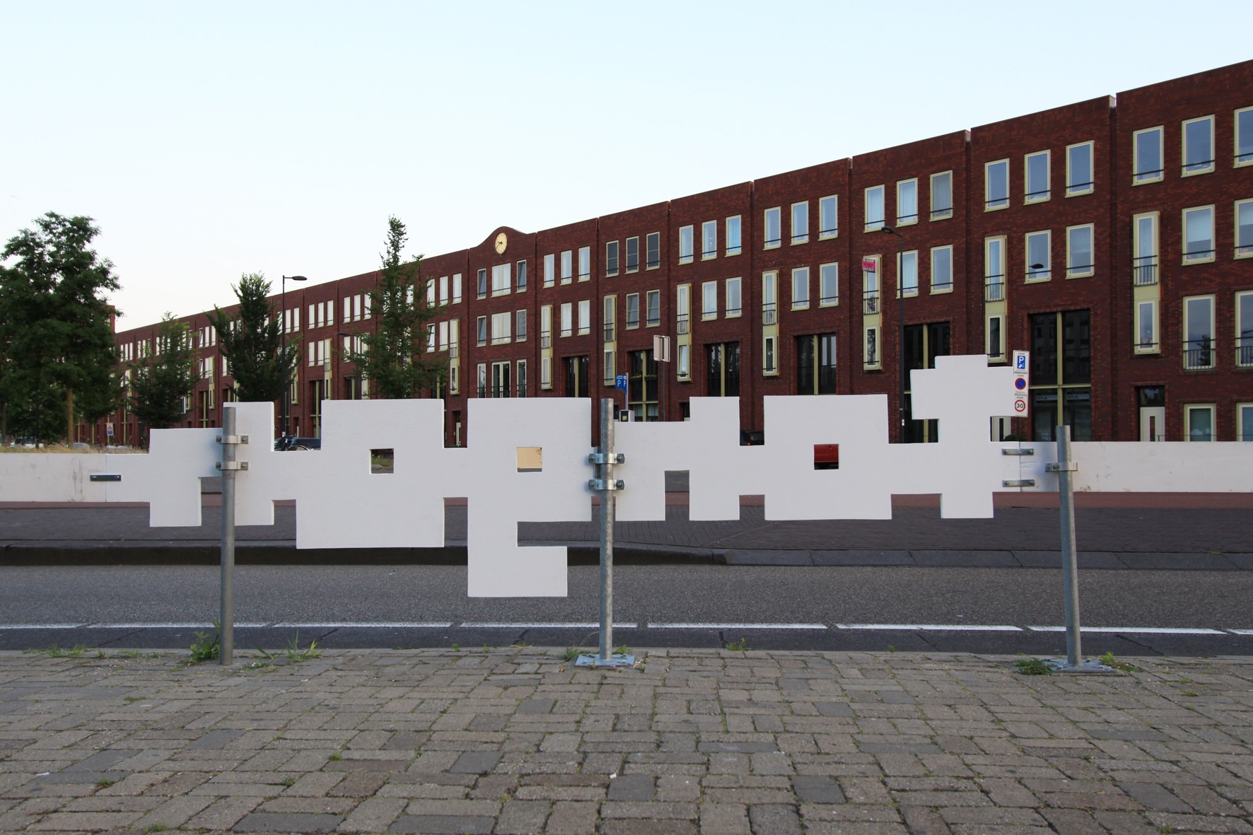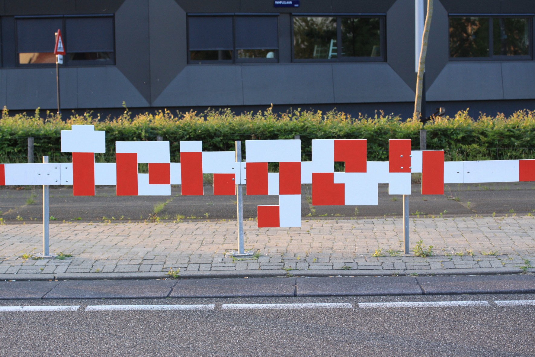 The finally chosen work Meaningful Moments in Unspectacular Places is a transformation of a part of the wooden barrier of a tram stop in front of the IJburg College (Pampuslaan 1). Interacting with the red and white design the intervention almost looks like a digital disturbance from a distance. But coming closer the word „tongen” becomes cognizable; the Dutch expression for French kissing/ tongue kissing.