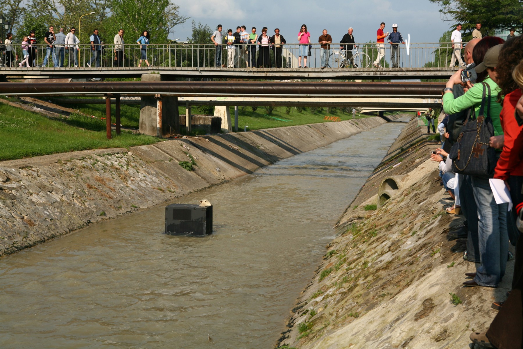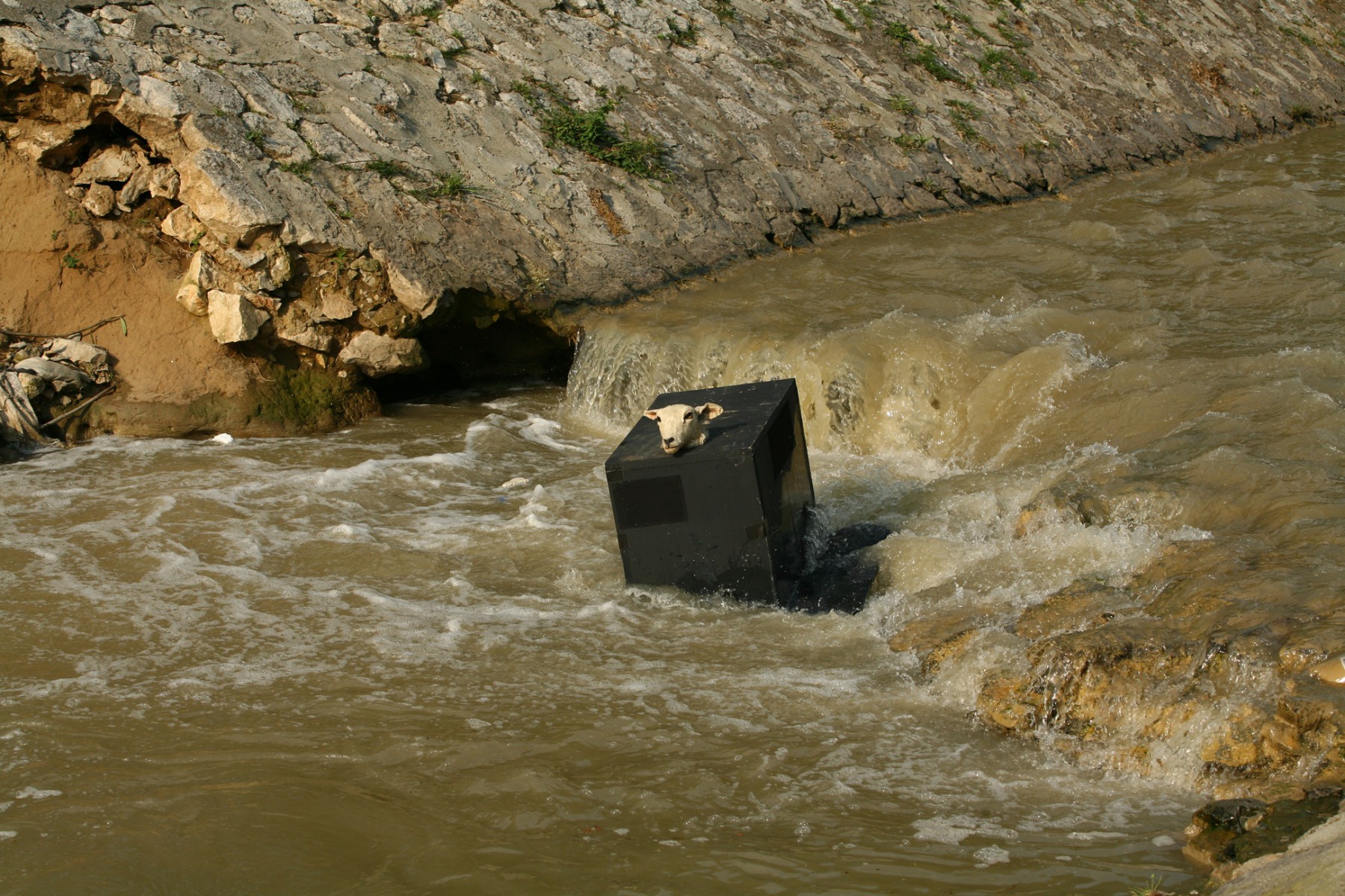 A furious dog barking and growling is sounding out of a black box that is floating on the canal of the river Lana in the city center of Tirana, Albania. A sheep, with his head sticking out of the box, seems to be captured in the drifting object.