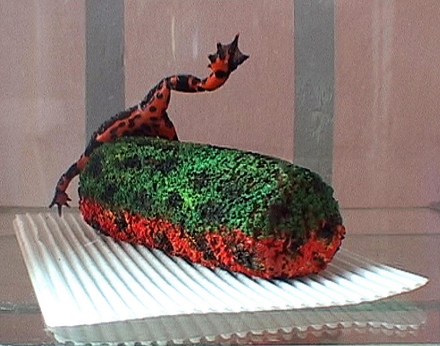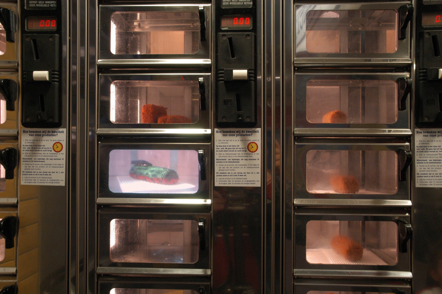 One of the ‘warm food’ compartments at a snack bar at Breda train station seems to be mixed up with a terrarium: A greenish red frog with black spots is jumping around a similar looking croquette...